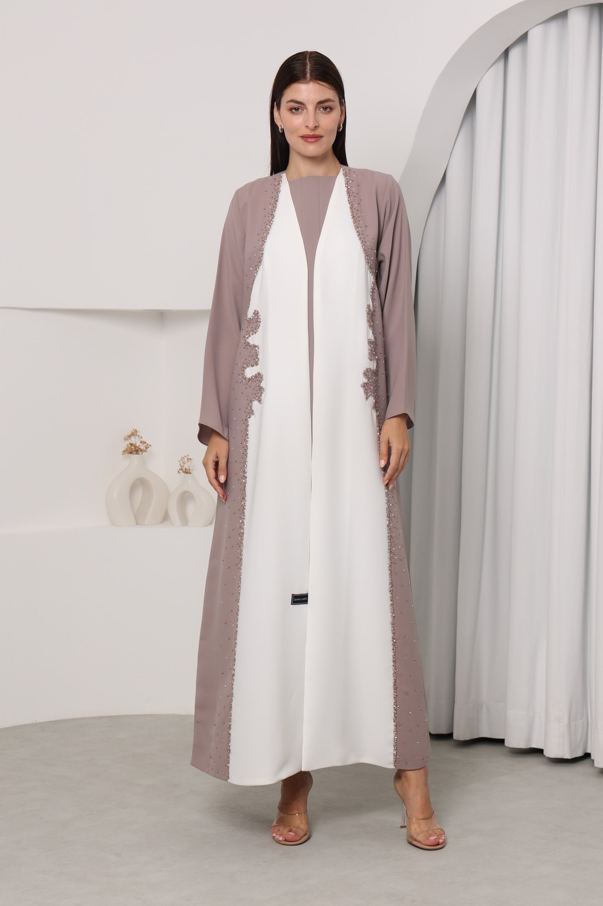 This abaya in charcoal grey features an intricate floral embroidery clustered at the chest, cascading downward. Curvy designed sleeves complimented by matching floral white centre.