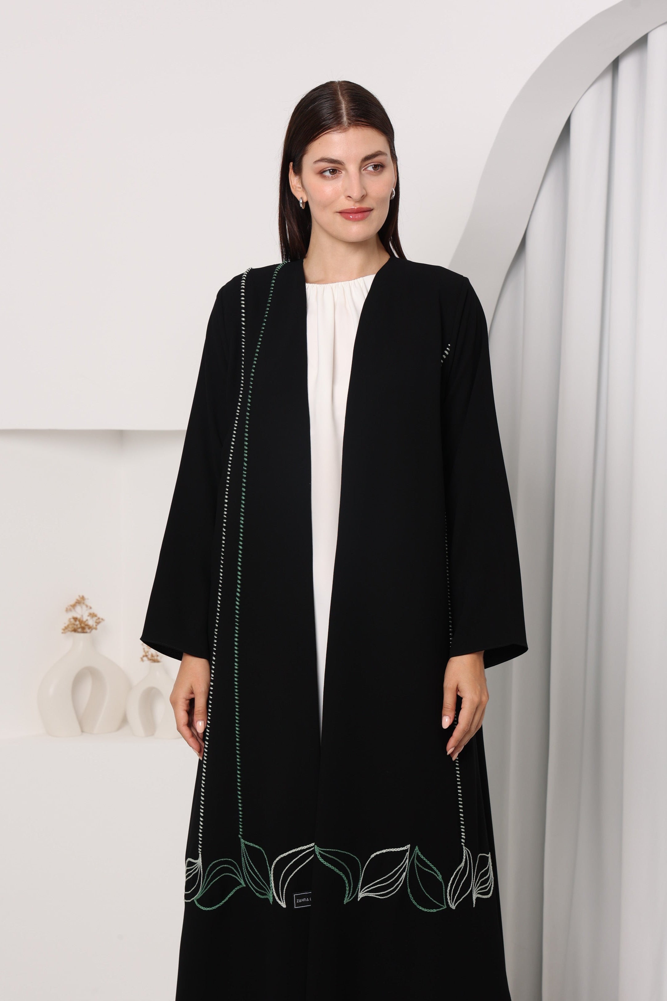 This abaya in jet black features a linear embroidery over piping along the hemline and edges, connected by geometric leaf like embroidery in green hues adding structure to the flowing design.