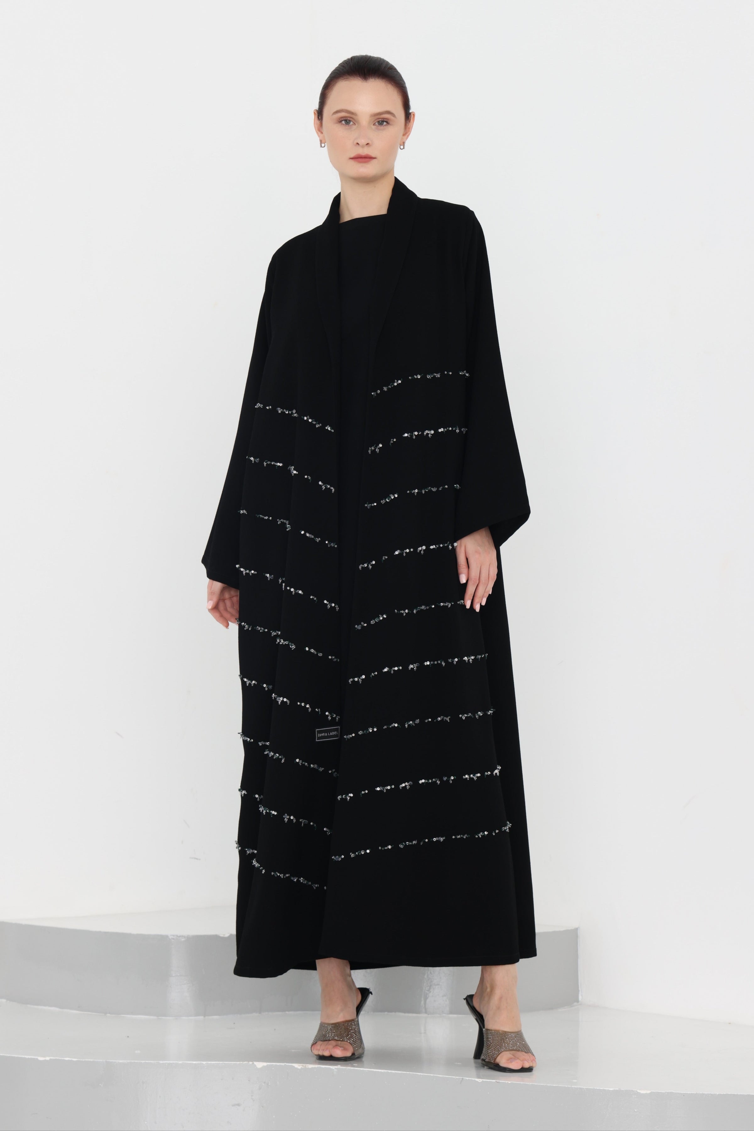 This modern black abaya showcases a sleek open-front design, adorned with horizontal rows of subtle embellishments that add a contemporary flair.