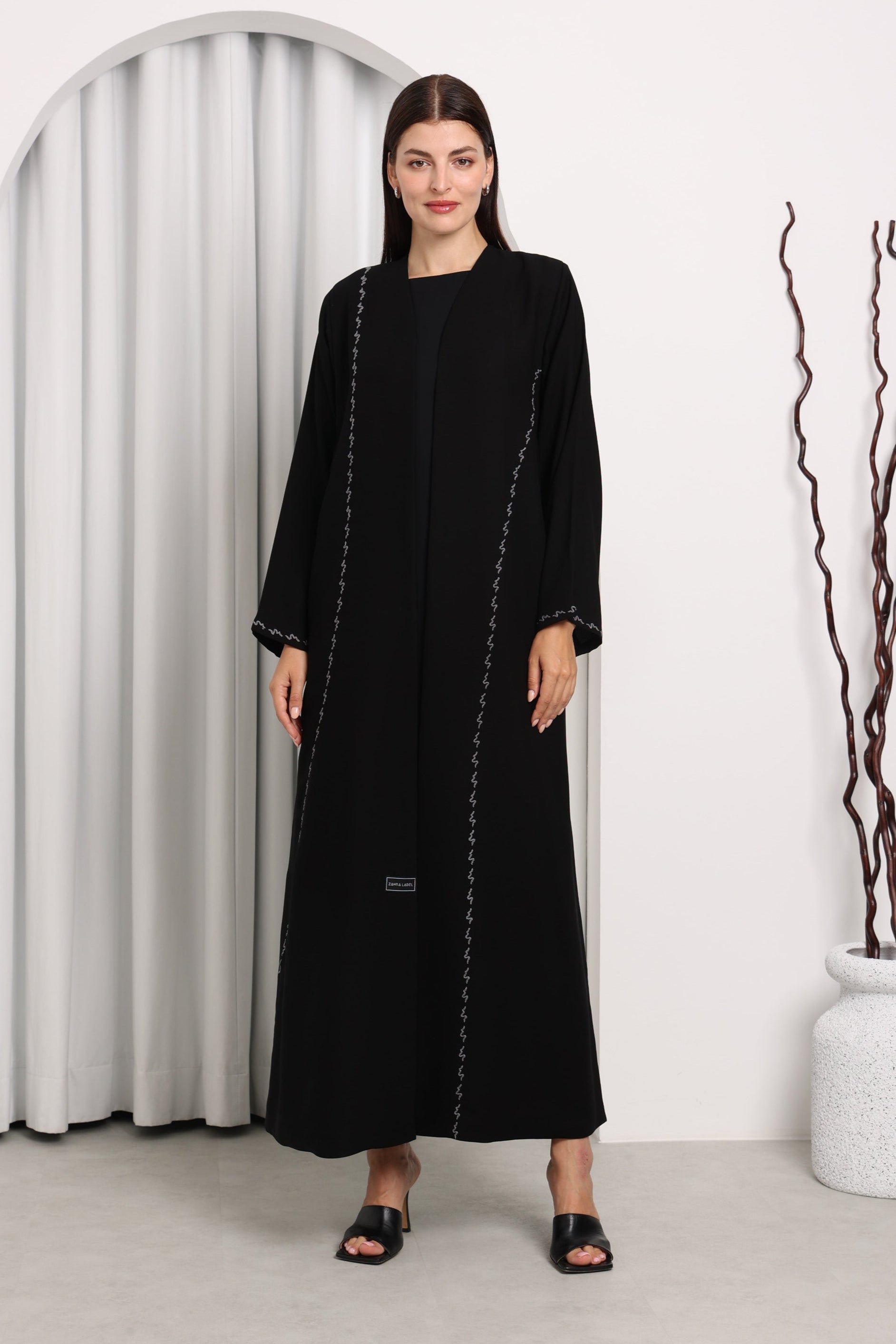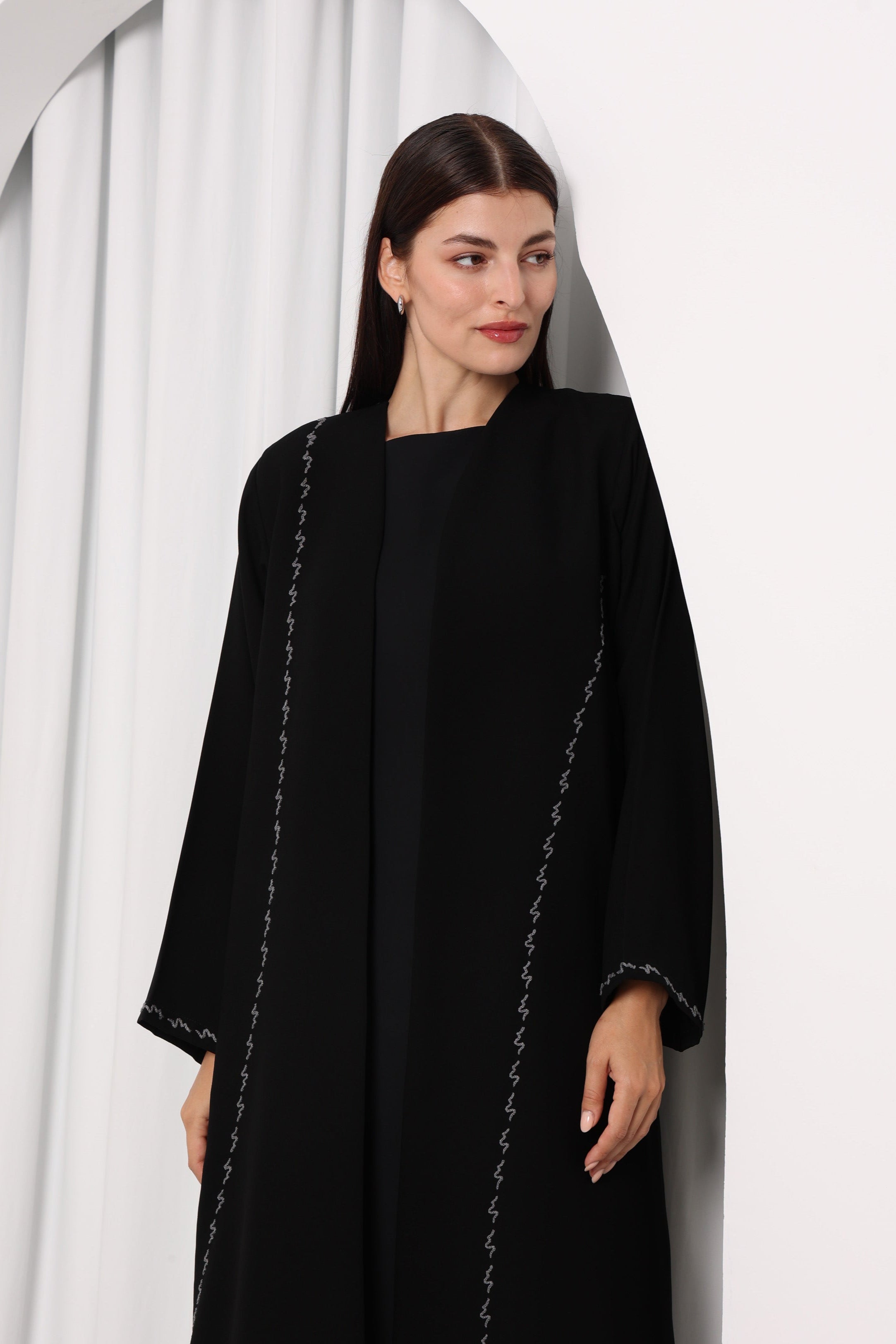 This abaya in jet black features a thin wave like tiny embroidery running vertically along