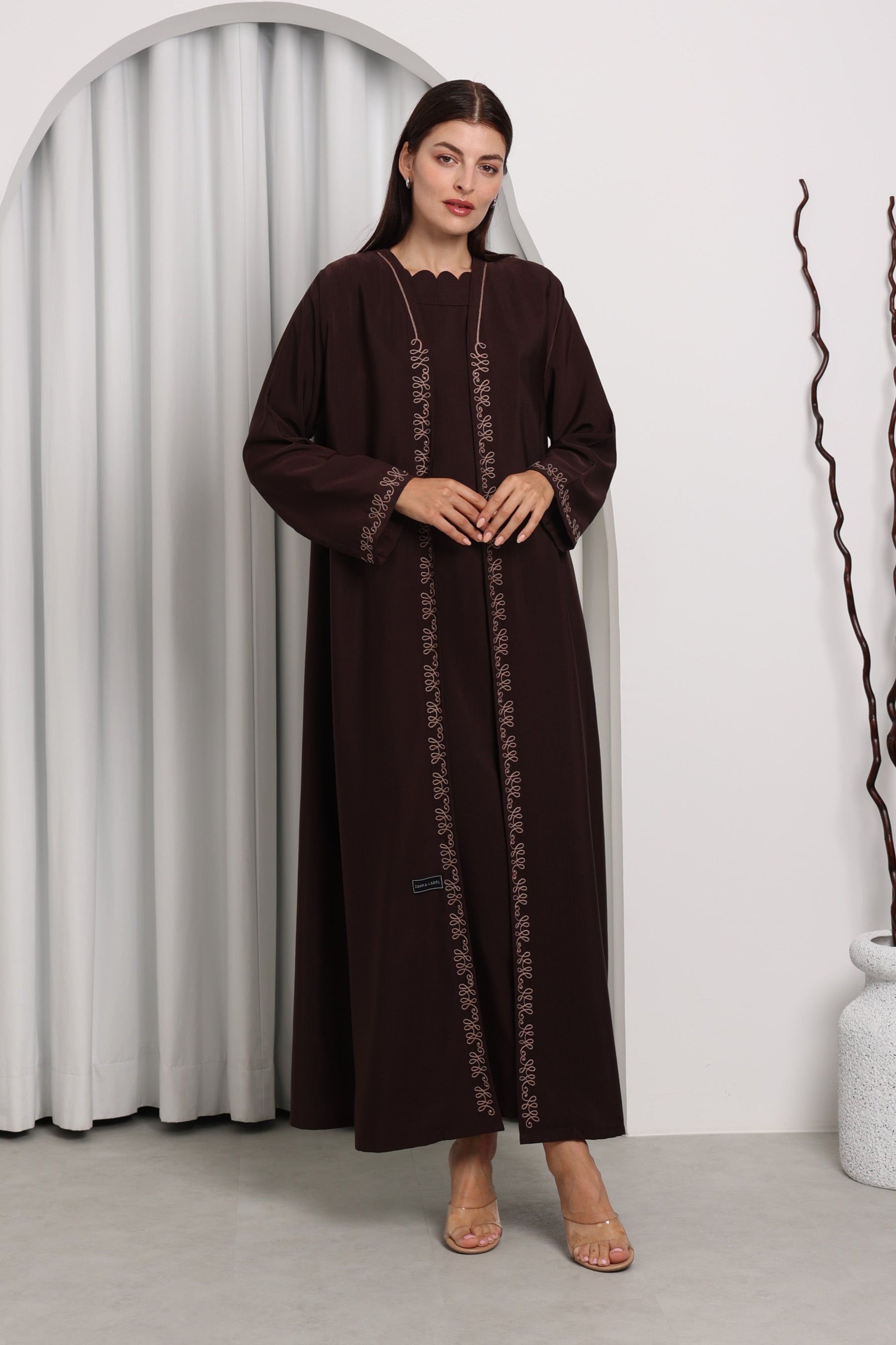This abaya in a deep chocolate brown features a symmetrical embroidery running