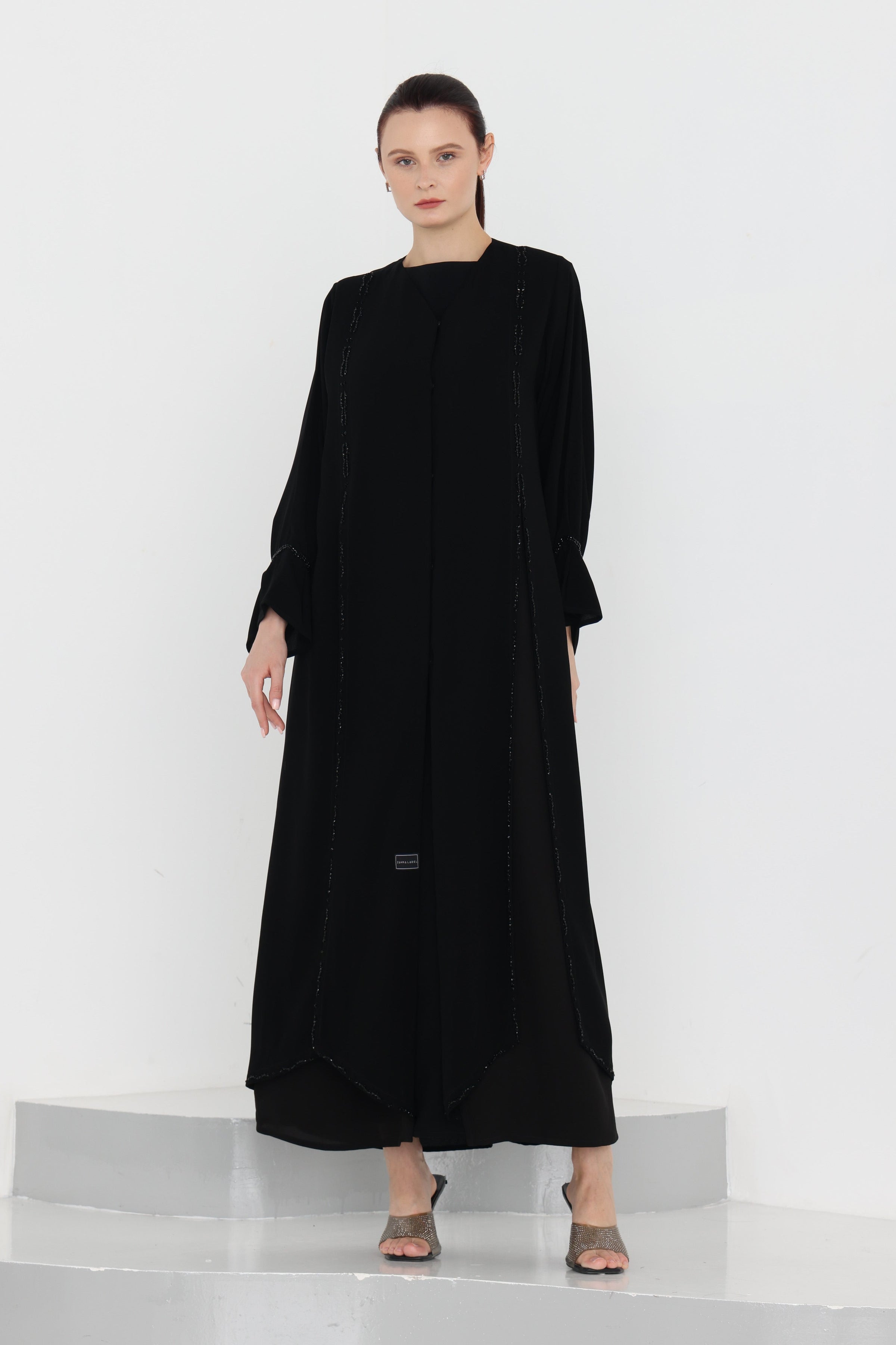 This elegant black abaya is designed with a soft, flowing silhouette and features a pointed hemline for a modern twist. Delicate bead detailing runs along the front and sleeve edges, adding a subtle shimmer and refined sophistication to the overall look.