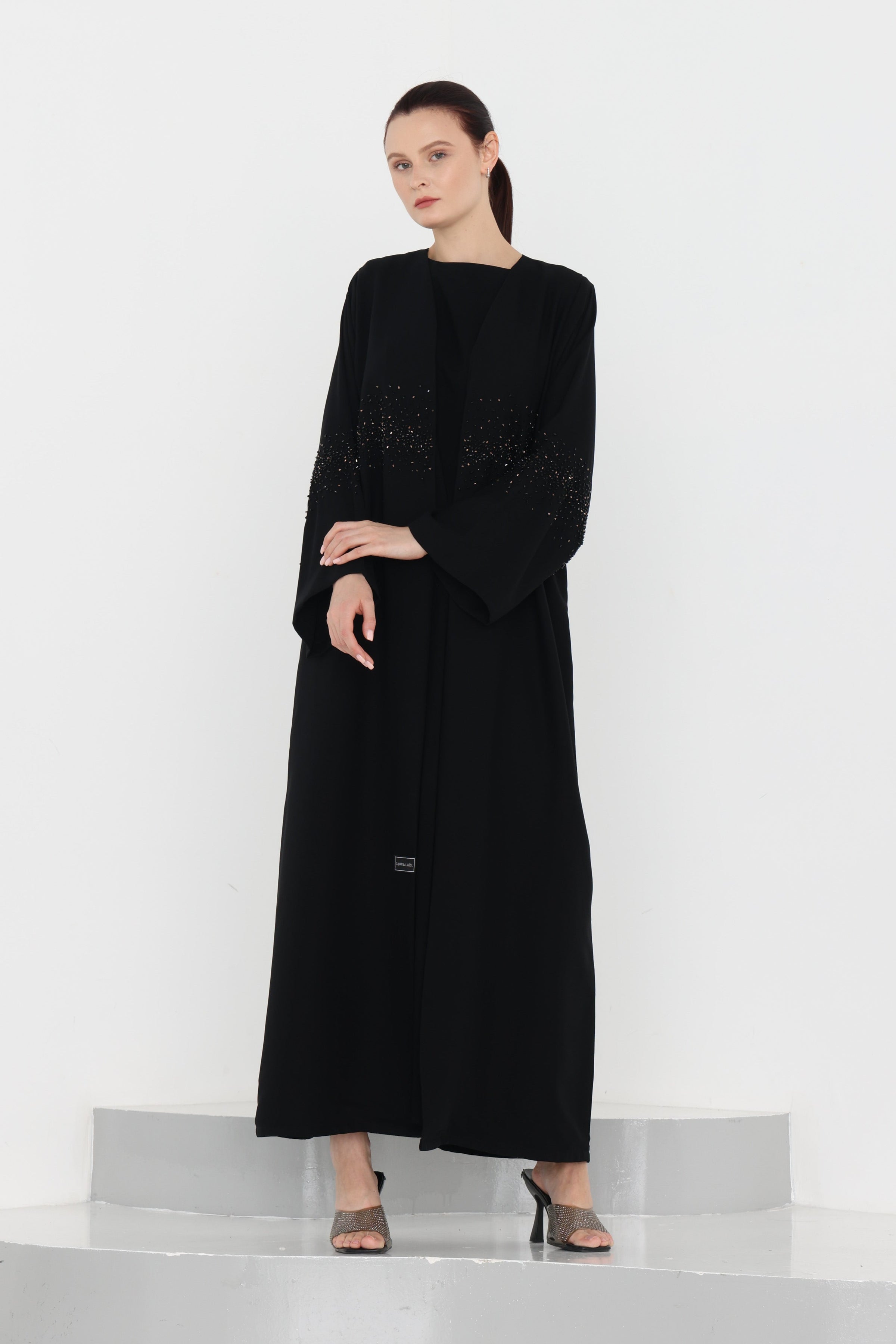 This sophisticated black abaya features a sleek silhouette adorned with intricate bead embellishments across the chest and sleeves, adding a touch of sparkle and refined elegance to the timeless design.