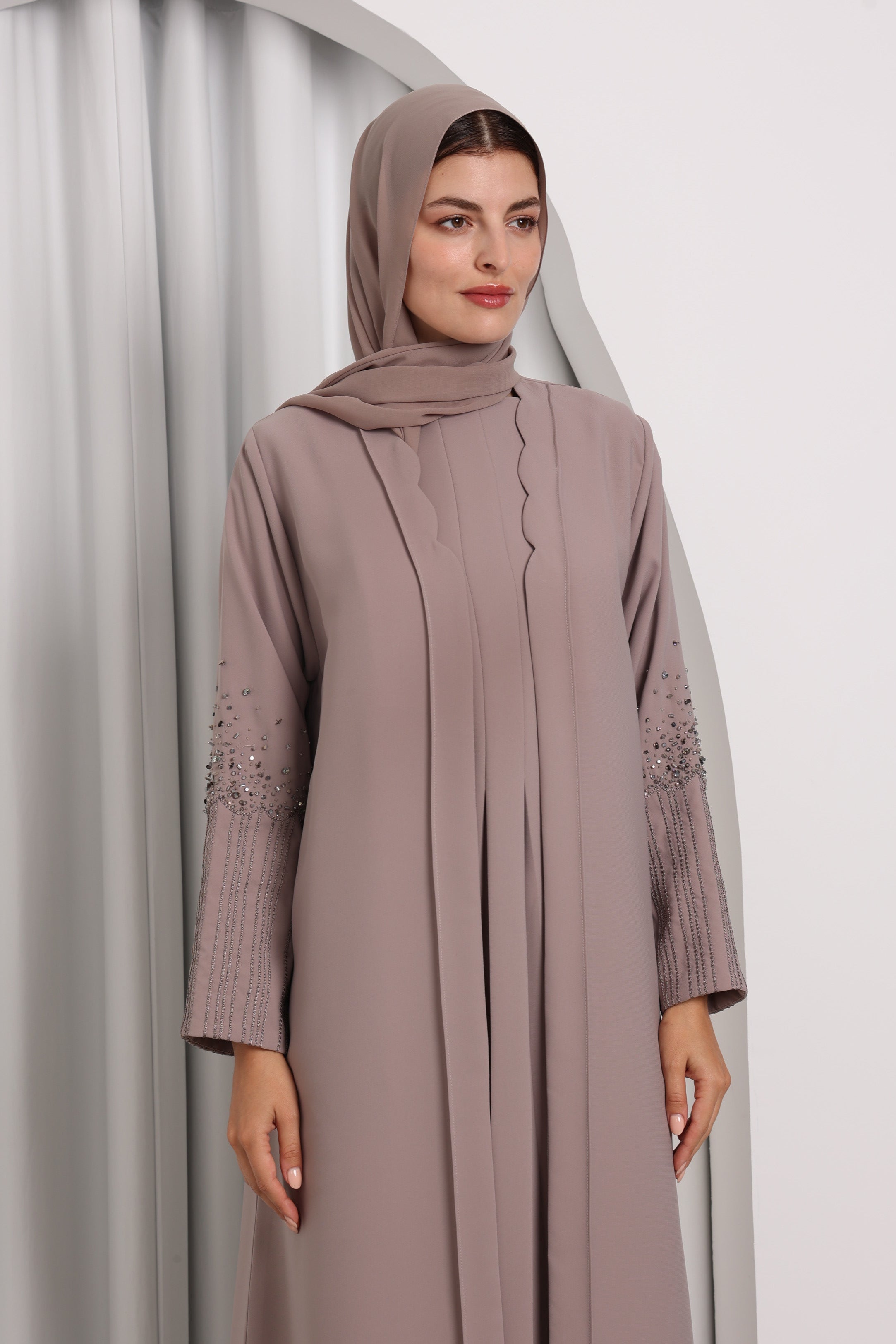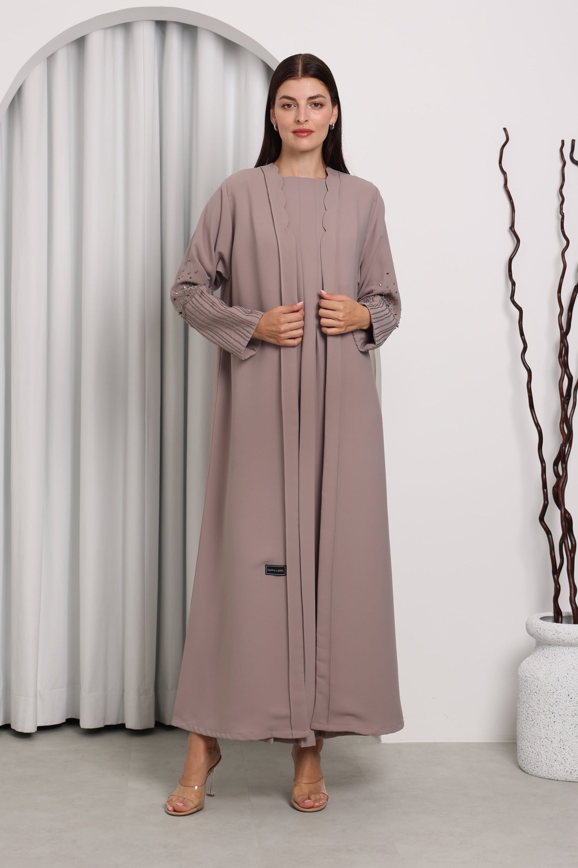 This abaya in soft beige features a scalloped neckline with vertical panel pleating and