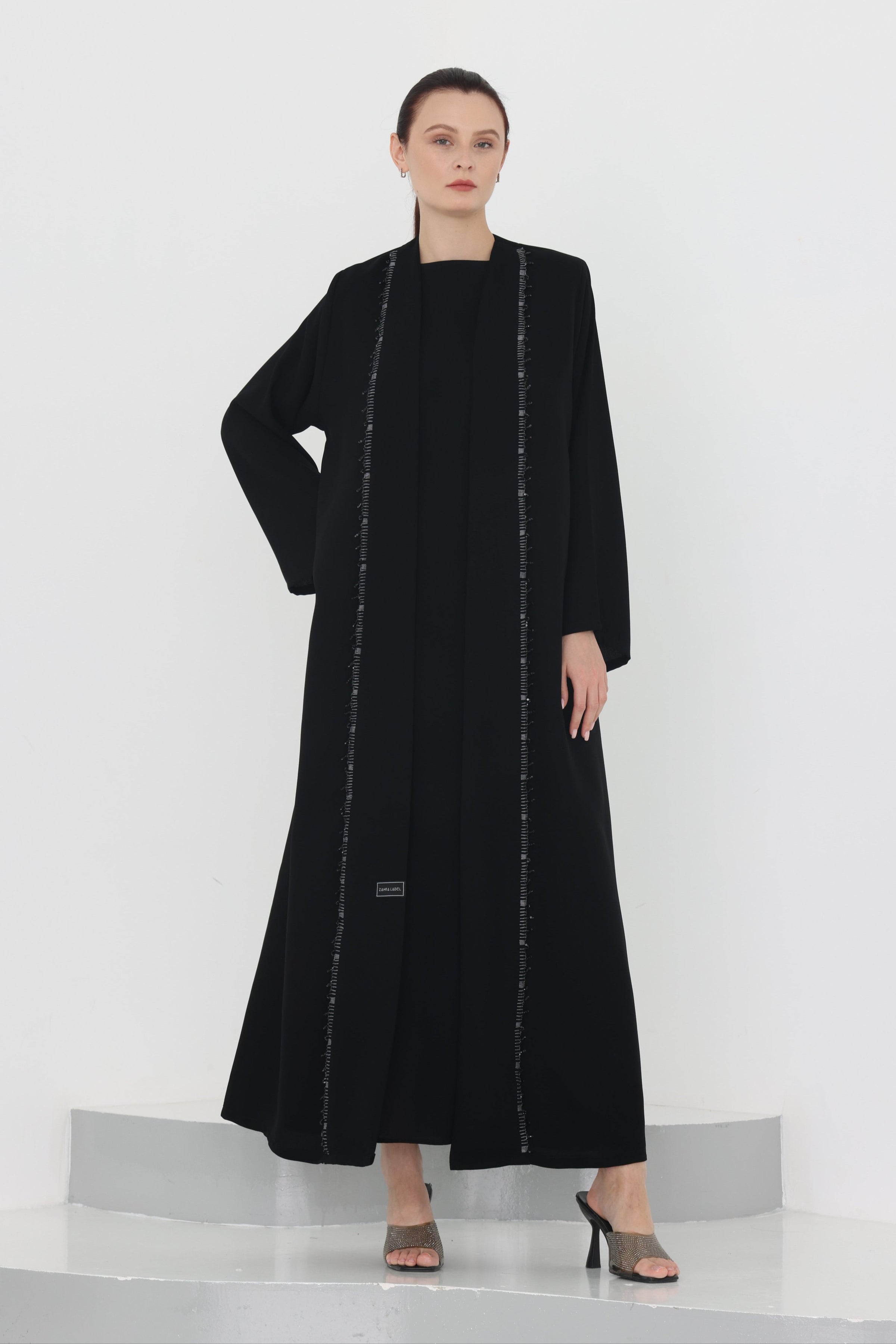 This chic black abaya features a streamlined silhouette enhanced by vertical sequin embellishments along the front edges.