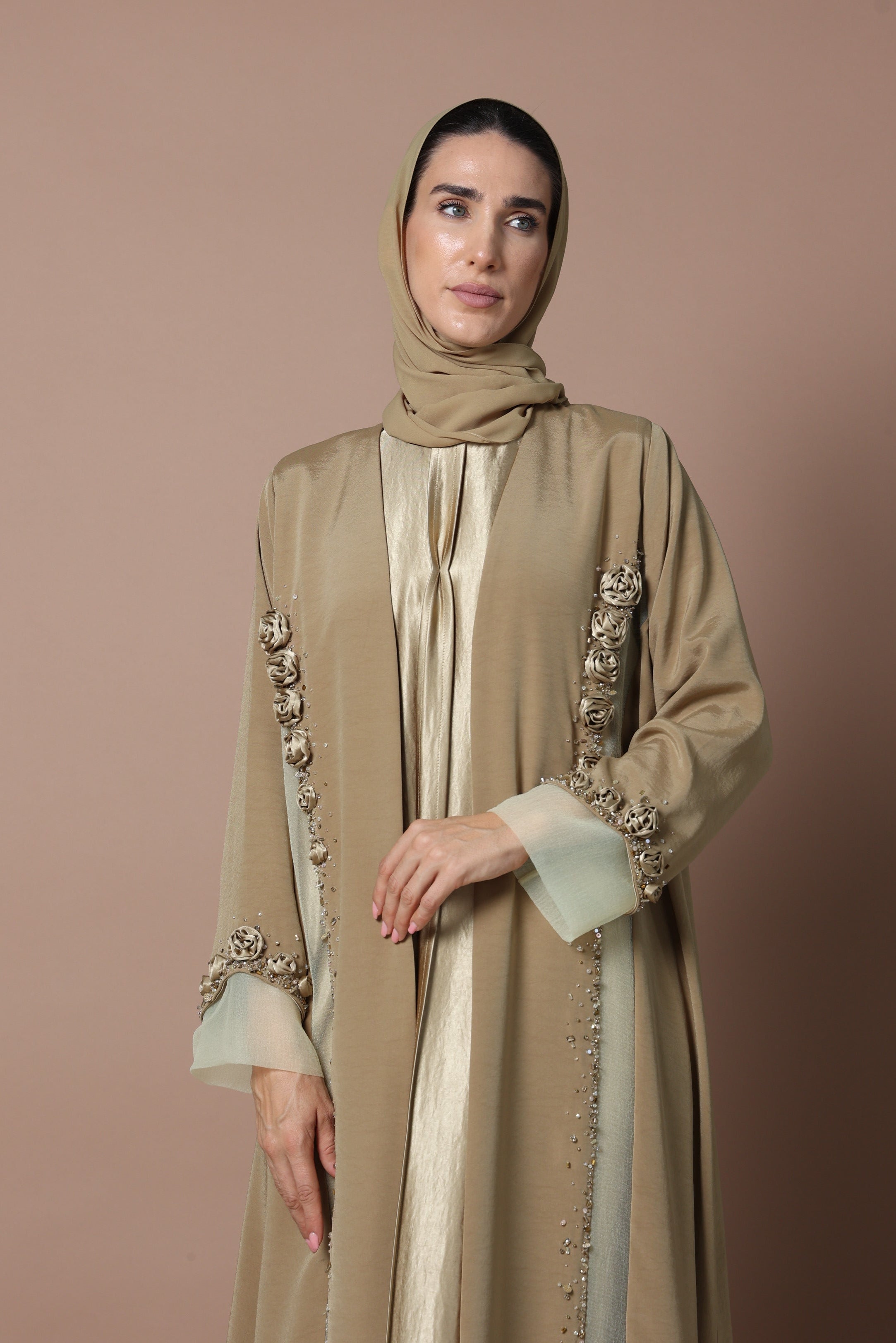 Ethereal and refined, Moonstone Sand captures soft femininity and modern grace. The abaya is adorned with delicate accents that catch the light, paired with a matching dress that flows effortlessly. Ideal for daytime elegance and serene evening moments.